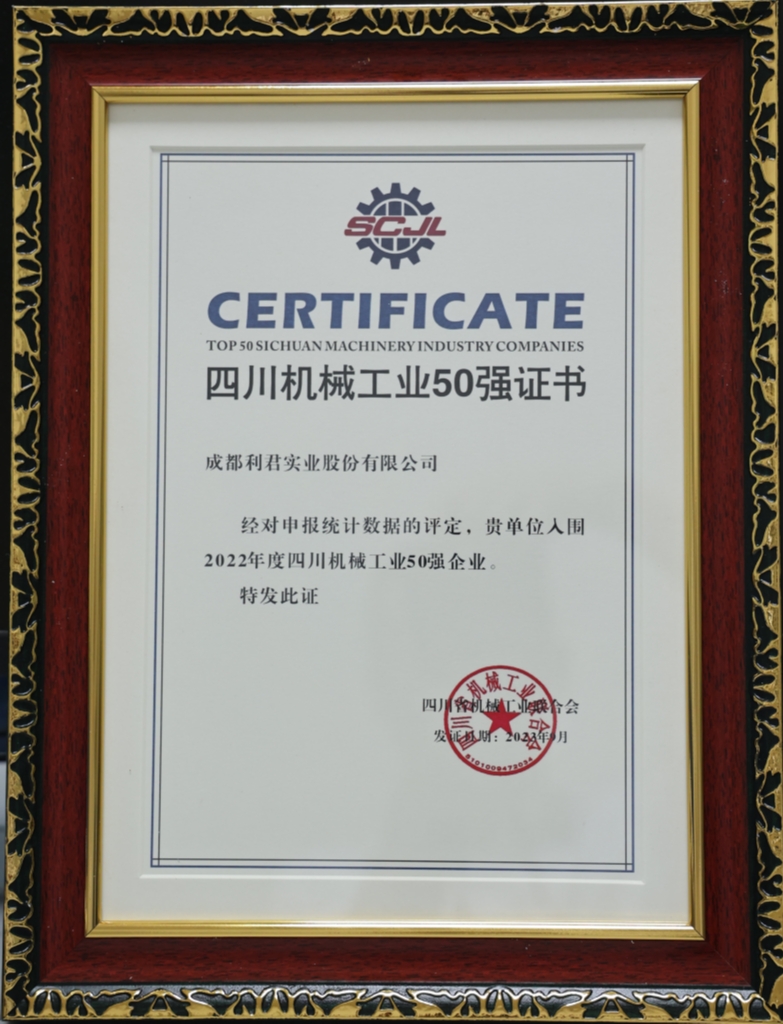 9月21日,四川省機械工業(yè)聯(lián)合會發(fā)布“2022年度四川機械工業(yè)50強企業(yè)”榜單,成都利君實業(yè)股份有限公司上榜。